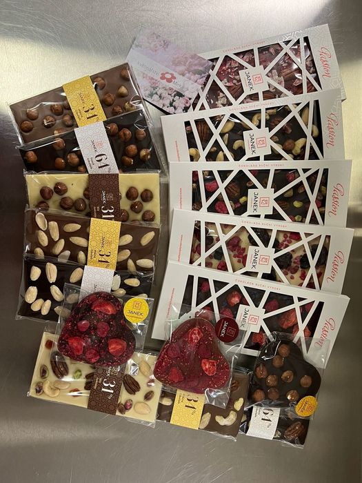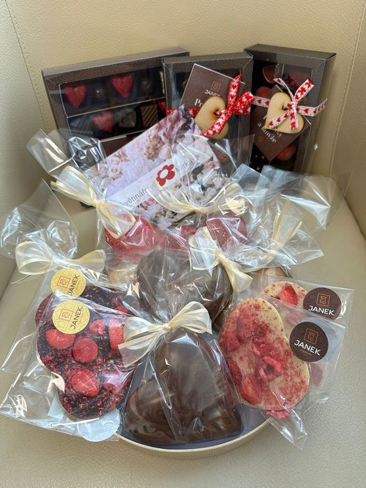 Kromě květin mají naši zákazníci již několik let v oblibě pravidelnou nabídku našich květinářství - a to: skvělé čokoládové valentýnské dárky, čokolády a srdíčka, pralinky ručně vyráběné v české firmě známé pod značkou Janek. Jde o luxusní ručně vyráběné čokolády se skvělou chutí a nádherným designem, které je předurčuje jako dárkové zboží. Můžete si vybrat z velkého množství čokolád a čokoládových srdíček a srdcí z kvalitní čokolády doplněné o oříšky, sušené, lyofilizované ovoce, koření a další zajímavé produkty, které dávají čokoládě neopakovatelnou chuť a vůni. Přijďte si vybrat valentýnské čokolády Janek do některého z našich květinářství v Třebíči.