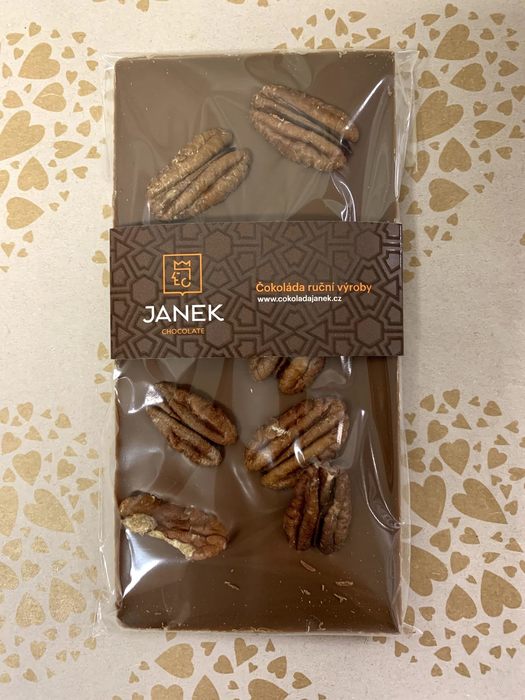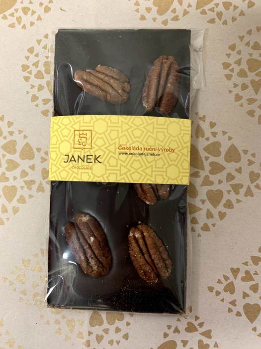Kvalitní čokoláda od české firmy Janek. Kombinace té nejkvalitnější čokolády s pekanovými ořechy je zárukou neopakovatelné chuti a zážitku při jejím ochutnávání. V této čokoládě také chuť přírodní vanilky a kakaové boby ze Sumatry.