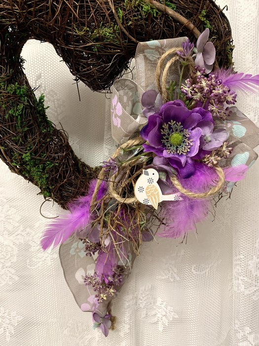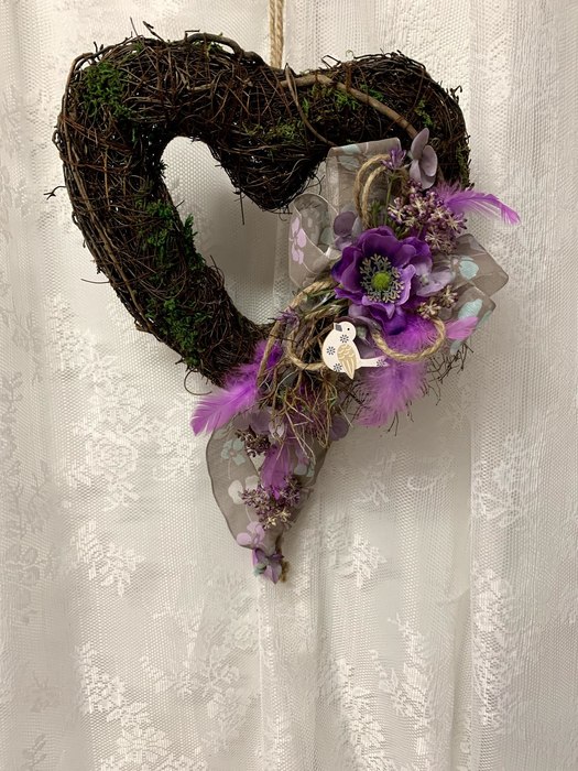 Proutěné srdce s přízdobou do fialové barvy